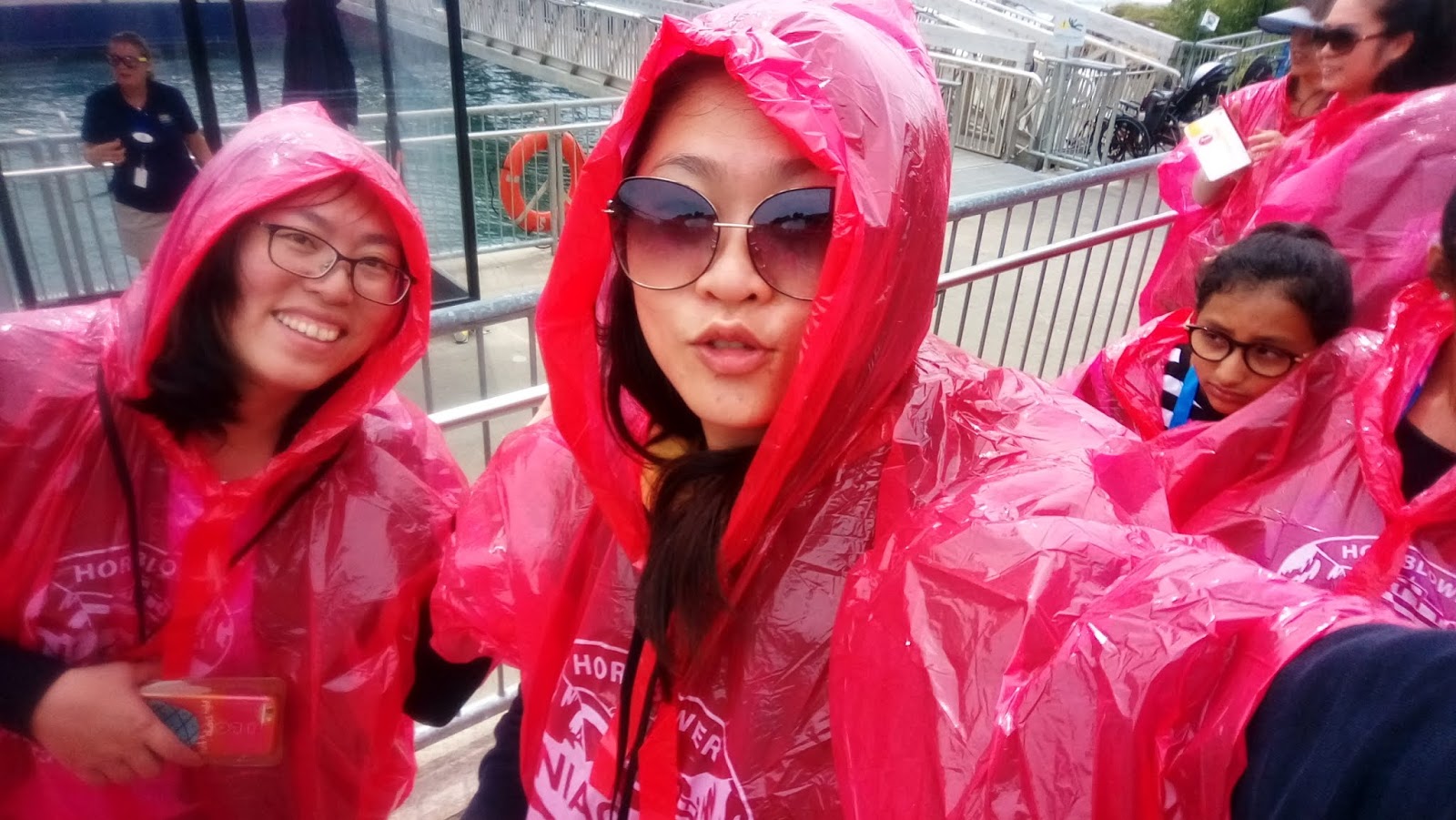 買玩票到要入場,也是要繼續排隊,搭乘電梯到下面之後,進場前他會先發雨衣給大家,因為我們是從加拿大國土出發,所以拿到的是紅色雨衣,如果你是從美國出發,拿到的就是藍色雨衣,基本上,據說在加拿大看比較美,在美國看比較醜,有錢有閒的人可以比較一下,反正過個橋就是美國了。